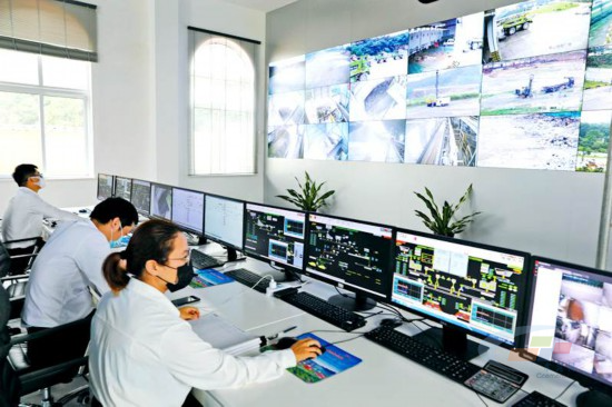 工作人员在露天矿山无人运输系统云控平台智能调度中心进行实时管理