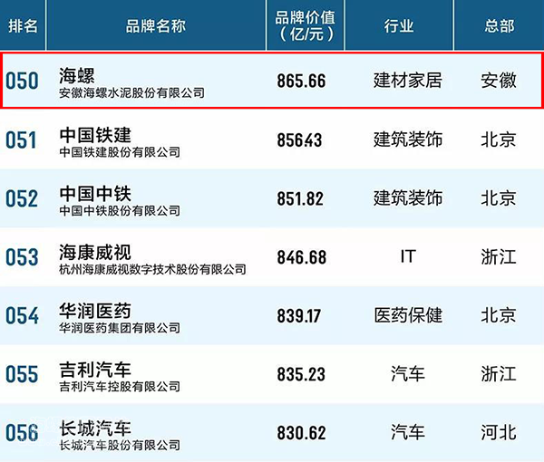 2019年11月30日,中国品牌价值500强评审委员会揭晓第十三届中国品牌价值500强榜单,“海螺”以865.66亿元的品牌价值,位列排行榜第50位,名次较上一届上升27位。