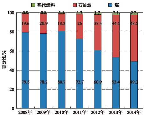 在2008~2014年里,印度最大的水泥生产商Ultratech公司增加了它的替代燃料使用率,从0.9%增加到2.2%(见图10)。然而在同一时期,石油焦的使用从19.6%增加到48.5%;同时,煤的比例从79.5%下降到49.3%。现在使用的燃料近一半是石油焦,如果替代燃料可以忽略不计的话,另一半使用的就是煤了。