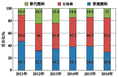 西班牙Cementos Portland Valderrivas (CPV)公司的Monjos水泥厂,2011年开始烧替代燃料,2012年达到最大的替代率(见图11),而石油焦的比例在2016年达到最大值。石油焦作为燃料与煤相比价格低20%以上,这对水泥厂来说是非常重要的。