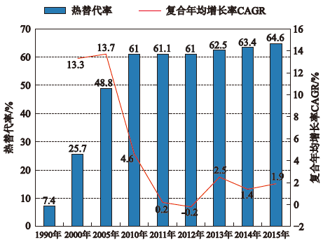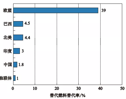 图2 世界各地区替代燃料替代率 图3 不同国家替代燃料的替代率
