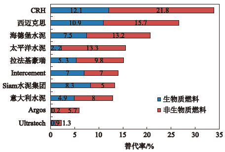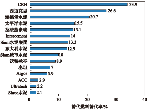 爱尔兰的CRH公司由于对拉法基豪瑞公司3 500万t以上的水泥生产能力的兼并,使其在替代燃料利用方面是目前世界领先的水泥生产商,全公司的替代率为33.9%,其次是西迈克思公司的26.6%,海德堡水泥是20.7%,拉法基豪瑞公司降到第5位。
