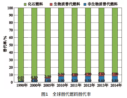 根据世界可持续发展工商理事会及水泥可持续倡议“获得准确数据”(GNR)数据库提供的数据表明(见图1),全世界替代燃料的替代率从1990年的2%,增加到2000年的5.2%,2010年的12.2%,2014年的14.8%。年均增长约不到一个百分点,生物质燃料的份额从0.3%增加到了5%。